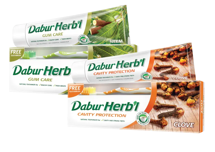 Dabur Herb’l Toothpaste is a range of natural toothpastes that helps you protect against dental problems with goodness of well known herbal ingredients like Clove, Neem and Tulsi. Eugenol, the main component of Clove, has analgesic (pain relieving) and anti-fungal properties that makes it a great choice for cavity protection.